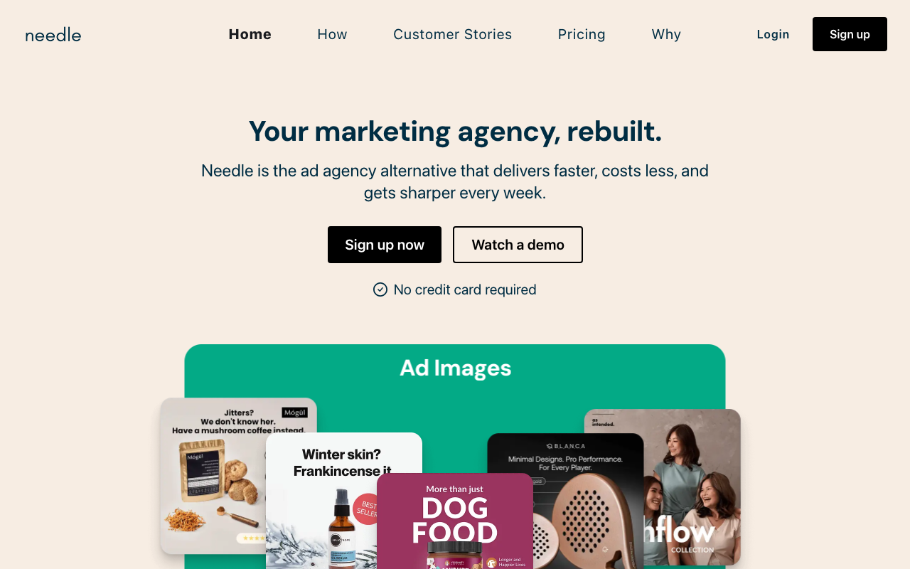 Needle is an AI marketing agency in one tab for Shopify DTC brands doing $1M–$10M. It connects to Shopify, Meta, and Klaviyo, reads what's working, and surfaces campaign ideas every Monday. AI drafts every asset. Needle's designers and editors polish it before anything goes near your brand.