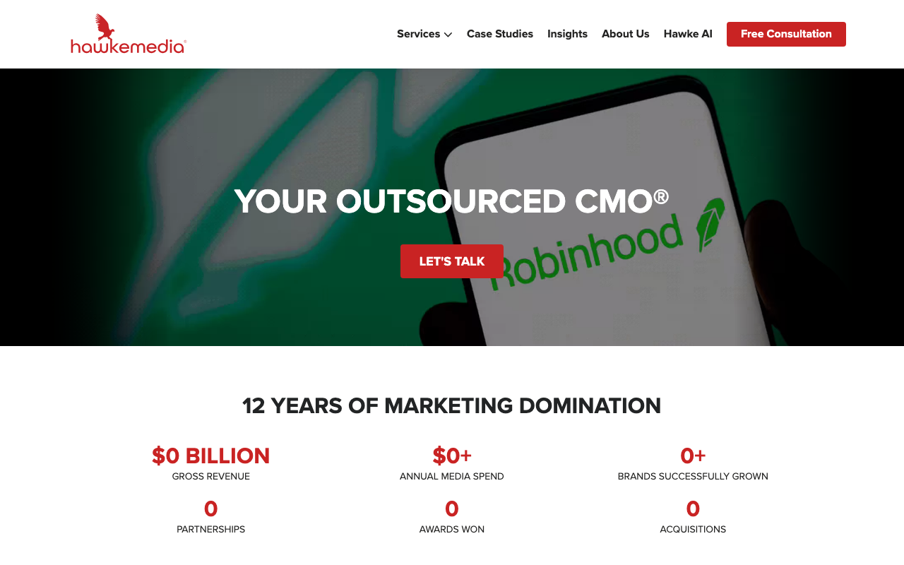 Hawke Media popularized the "CMO for hire" model in digital marketing. The idea: access a team of specialists — paid social, email, influencer, SEO — without committing to a full retainer or building in-house.